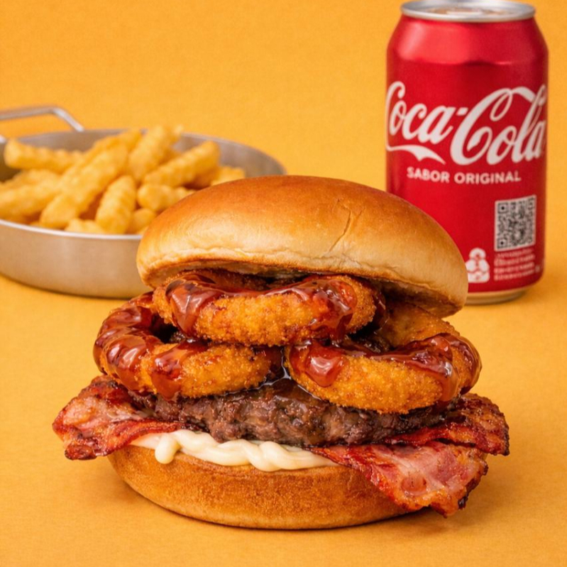 O Hambúrguer Marquês é o rei da parada: onion rings crocantes, 150g de carne suculenta, bacon irresistível, maionese defumada e um toque especial de barbecue. Uma verdadeira realeza de sabores que vai te conquistar!
