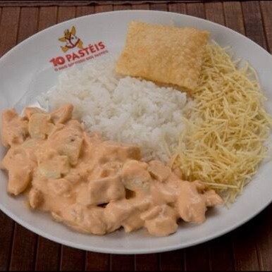 Cremosíssimo Strogonoff de frango com champignon, arroz soltinho, batata palha bem crocante e nosso querido pastel júnior de queijo.