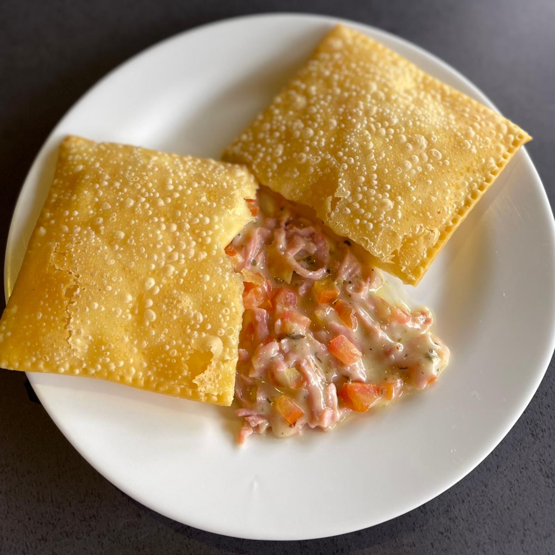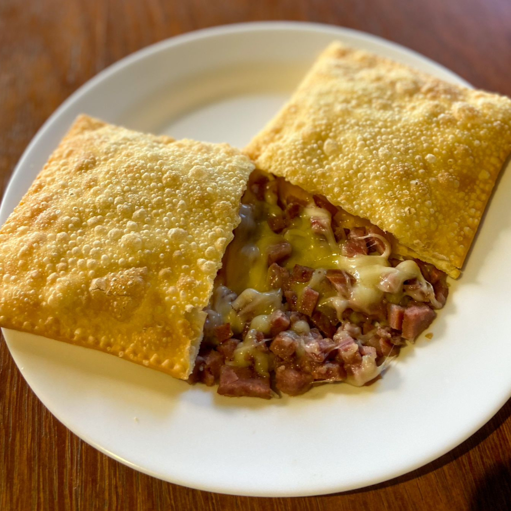 Pastel com recheio de pernil e queijo.