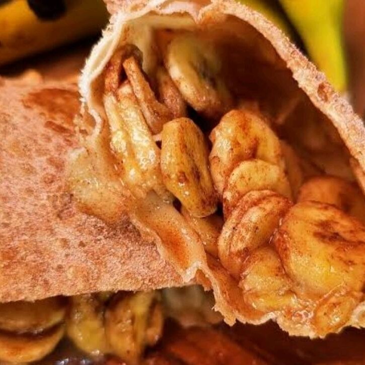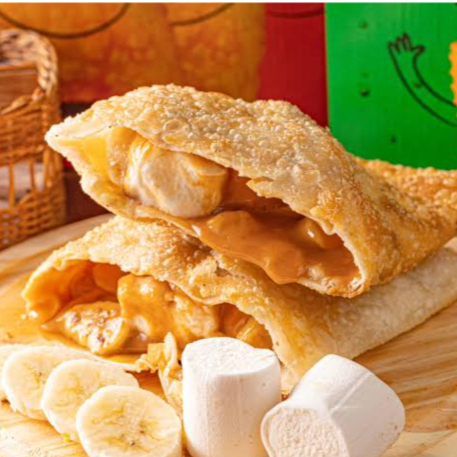 Pastel recheado com banana caramelizada e canela, envolto em uma massa crocante e frita na hora. Um doce perfeito para matar a vontade de sobremesa!