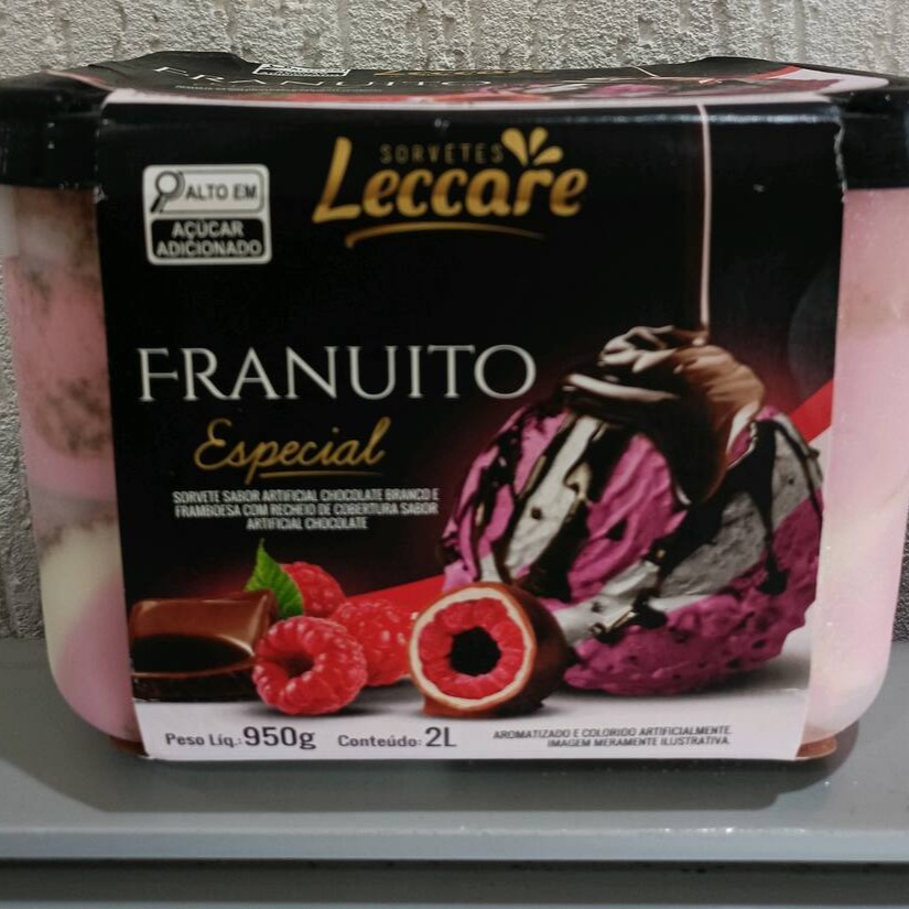 Sorvete sabor chocolate branco e framboesa com recheio e cobertura sabor chocolate.