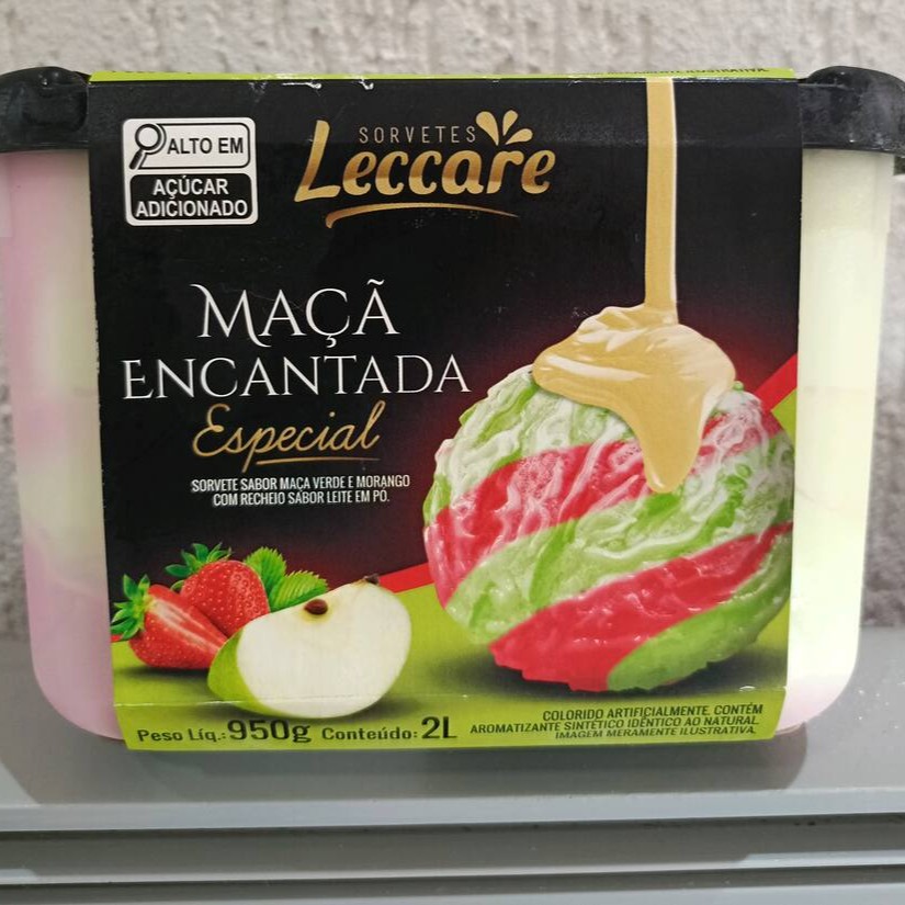 Sorvete de maçã verde com morango e recheio de sabor leite em pó.