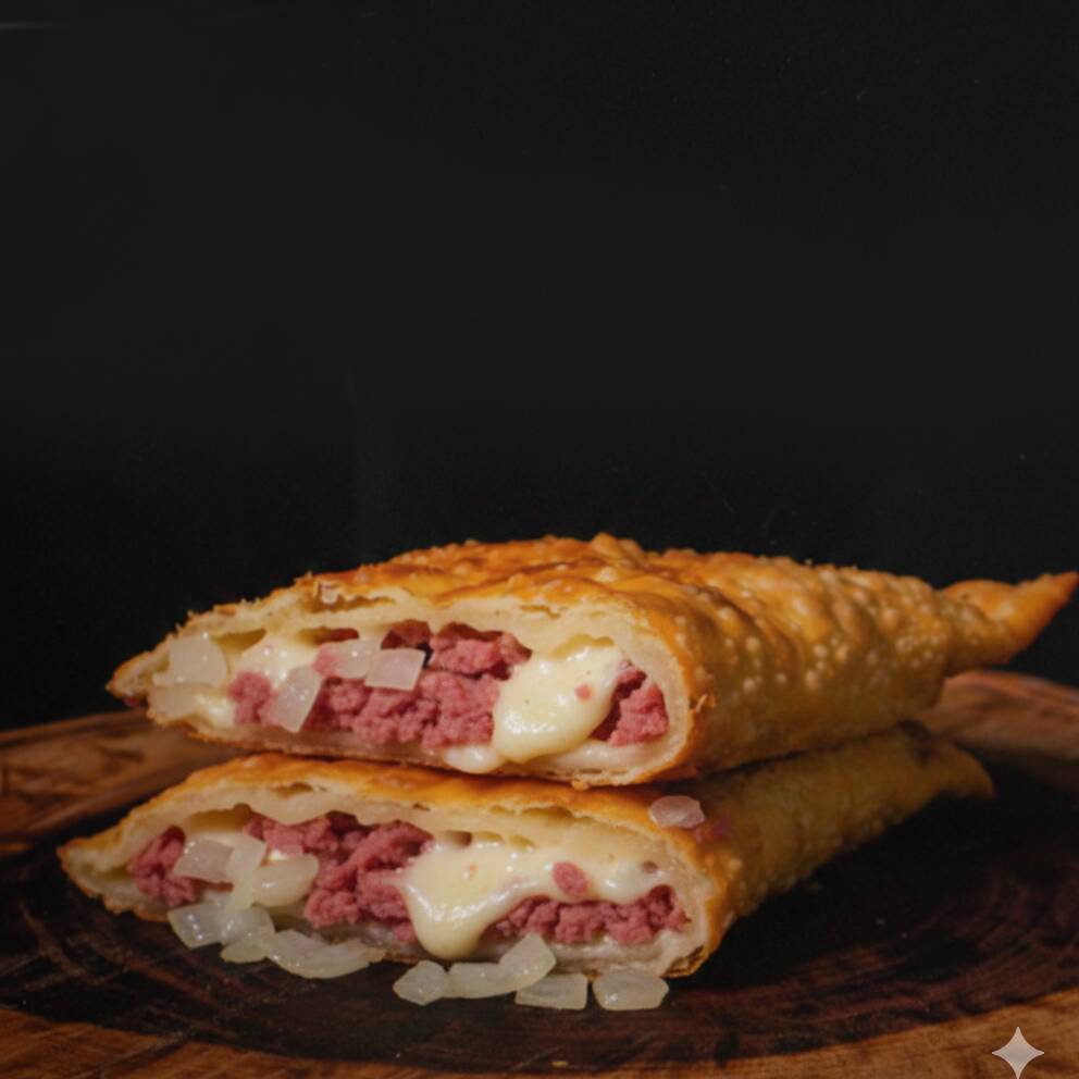 O pastel de carne com queijo é a combinação que nunca falha, unindo dois dos recheios mais pedidos em uma única delícia. A massa crocante abraça um recheio generoso de carne moída suculenta e bem temperada, misturada com a cremosidade do queijo muçarela derretido. Esta união oferece um sabor rico, encorpado e um contraste de texturas que o torna perfeitamente satisfatório. #pastel #pastelaria #hits #jantar #fretegrátis #desconto #promoção #oferta
