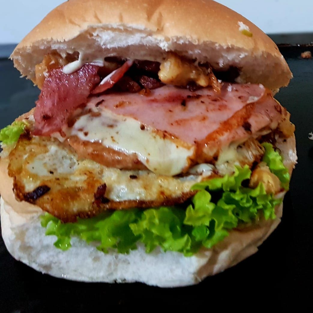 Pão maionese cremosa, ovo frito na chapa hambúrguer, queijo presunto tomate alface