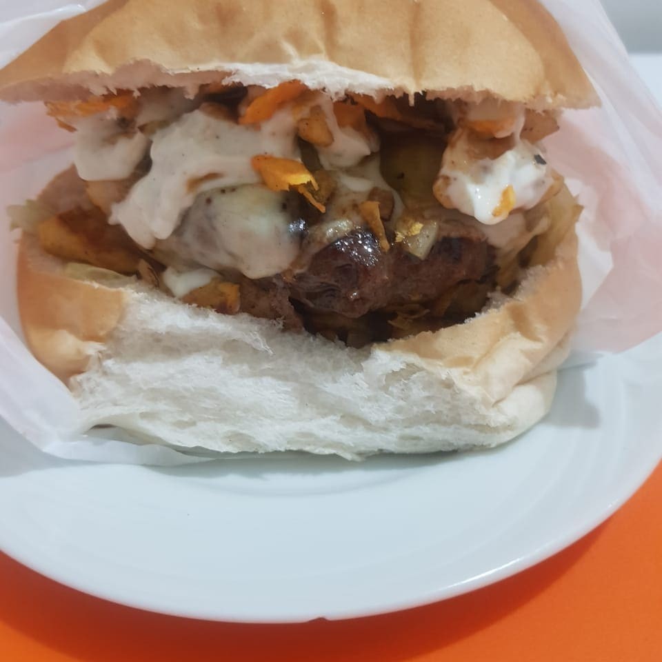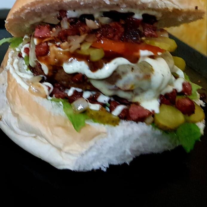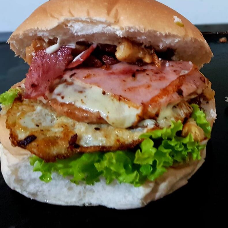 Pão maionese cremosa, hambúrguer ovo calabresa bacon batata palha, queijo presunto tomate alface
