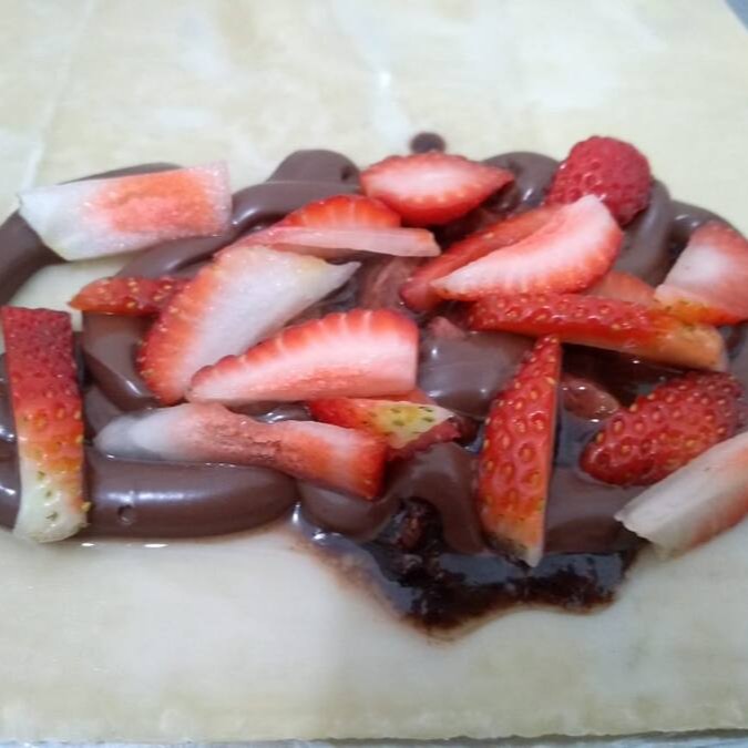 Massa sequinha e crocante recheado com chocolate branco trufado e morango picado.