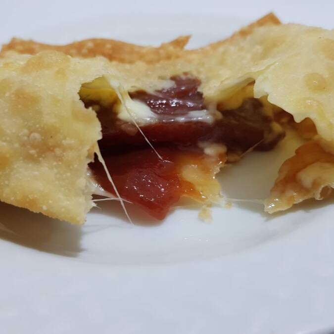 Massa sequinha e crocante recheada com costelinha de porco desfiada tomate e requeijão cremoso.