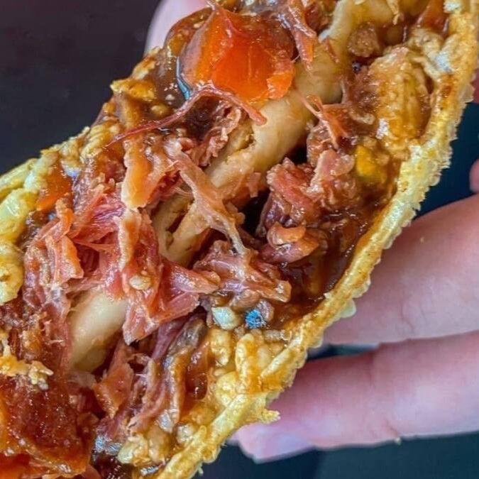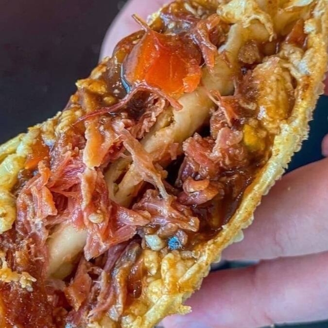 Massa sequinha e crocante com recheio de costelinha defumada tomate molho barbecue e cheddar cremoso