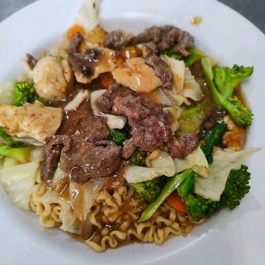 Receita familiar Japonesa com macarrão, verduras, alcatra, peito de frango e molho à base de shoyu. Escolha o tamanho