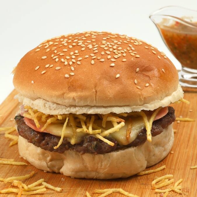 Hambúrguer artesanal, presunto, queijo, batata palha, maionese, alface e tomate.