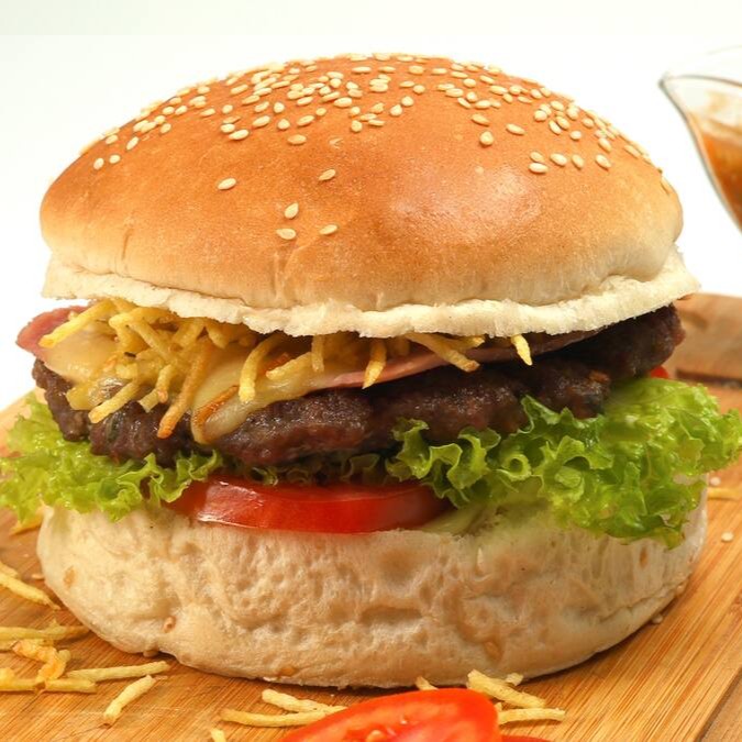 Hambúrguer artesanal, presunto, queijo, batata palha, maionese, alface, tomate e ovo.