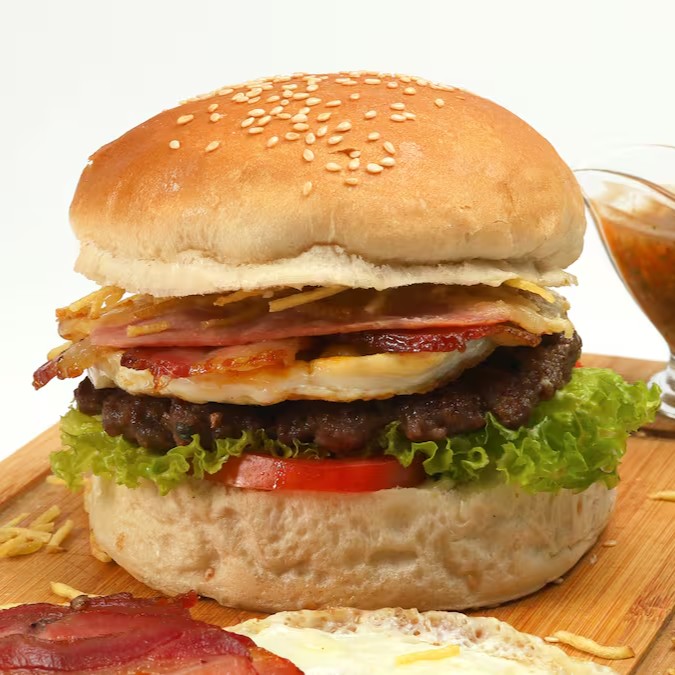 Hambúrguer artesanal, bacon, ovo, queijo, presunto, pão, alface, tomate, milho, maionese e batata frita.