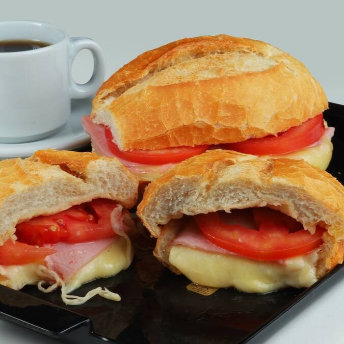 Pão com duas fatias de queijo, presunto, tomate e margarina