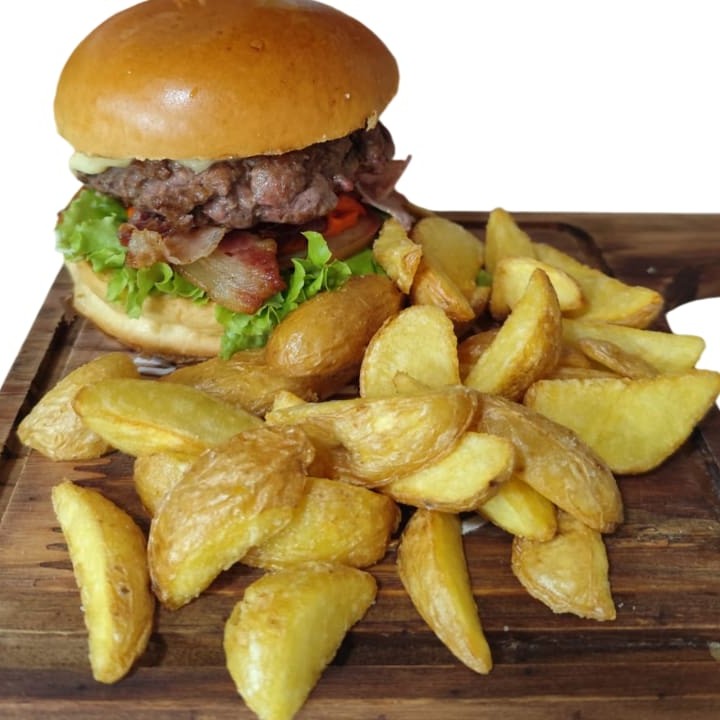 Suculento burguer de 150g,queijo cheddar , bacon , alface e tomate no pão brioche. Maionese e cheddar