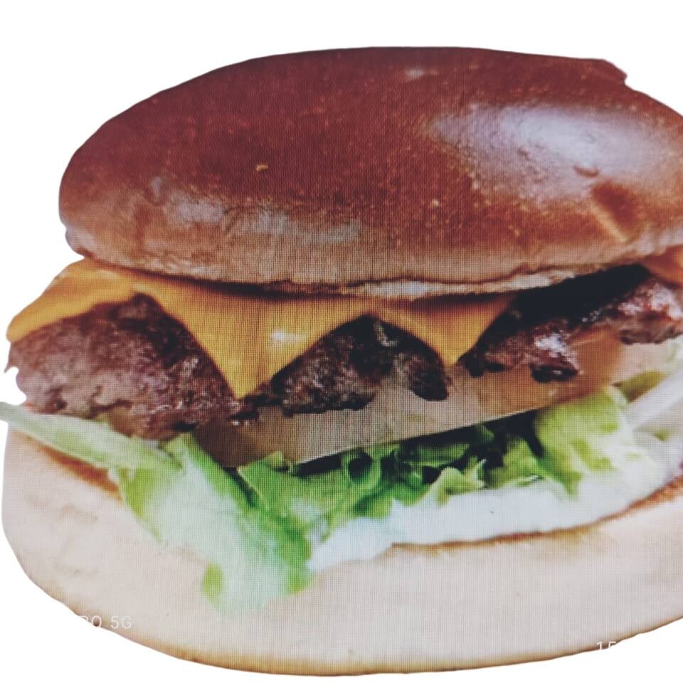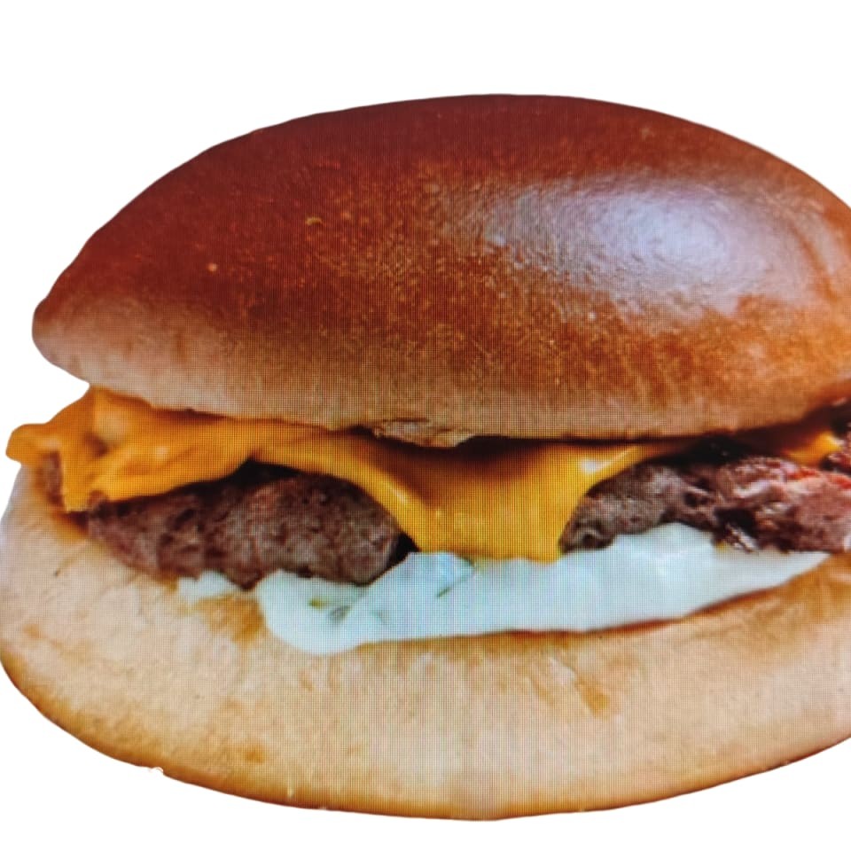 Suculento burger de 150g e queijo cheddar no pão brioche. Maionese