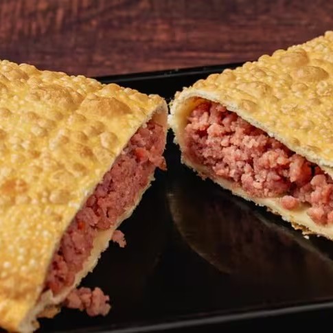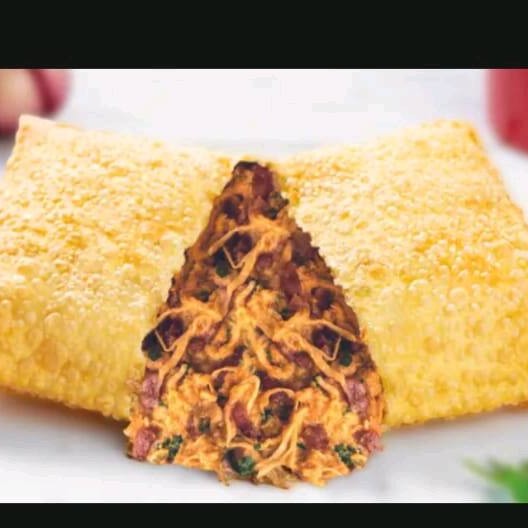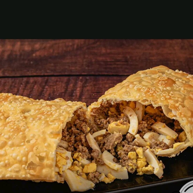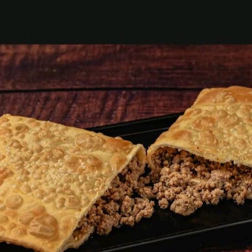 Um pastel recheado de carne moida temperada .envolto em uma Massa crocante e dourada ,perfeito para um lanche saboroso frito na hora .