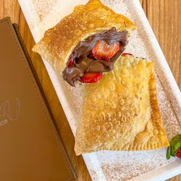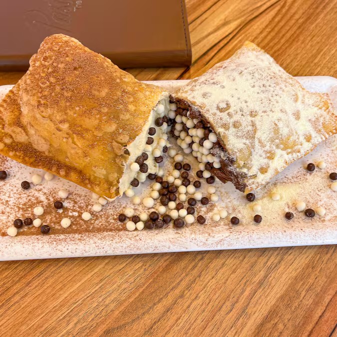 Pastel doce 2 amores, é a expressão do amor em um único pastel. Recheado com chocolate branco, chocolate preto e chocobol que explode a cada mordida.