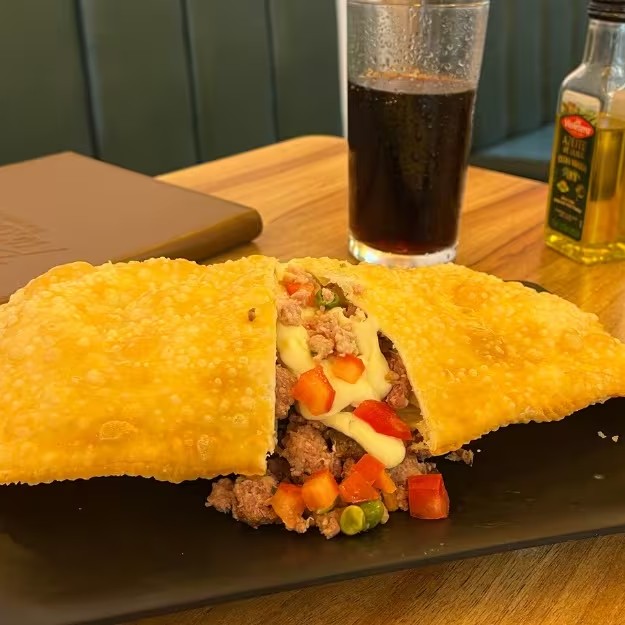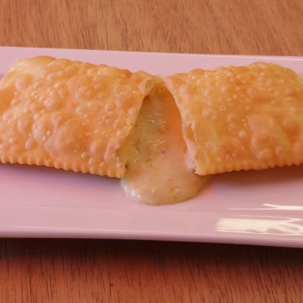 Pastel 5 queijos (queijo minas, queijo provolone, queijo gorgonzola, queijo parmesão e cream cheese).