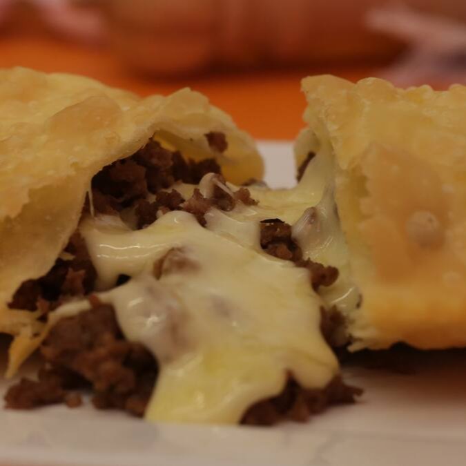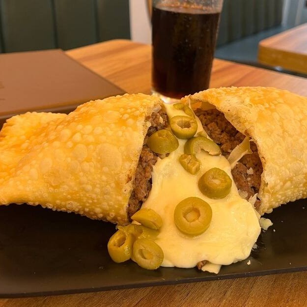 Pastel de carne de primeira, queijo mussarela e azeitonas verdes.