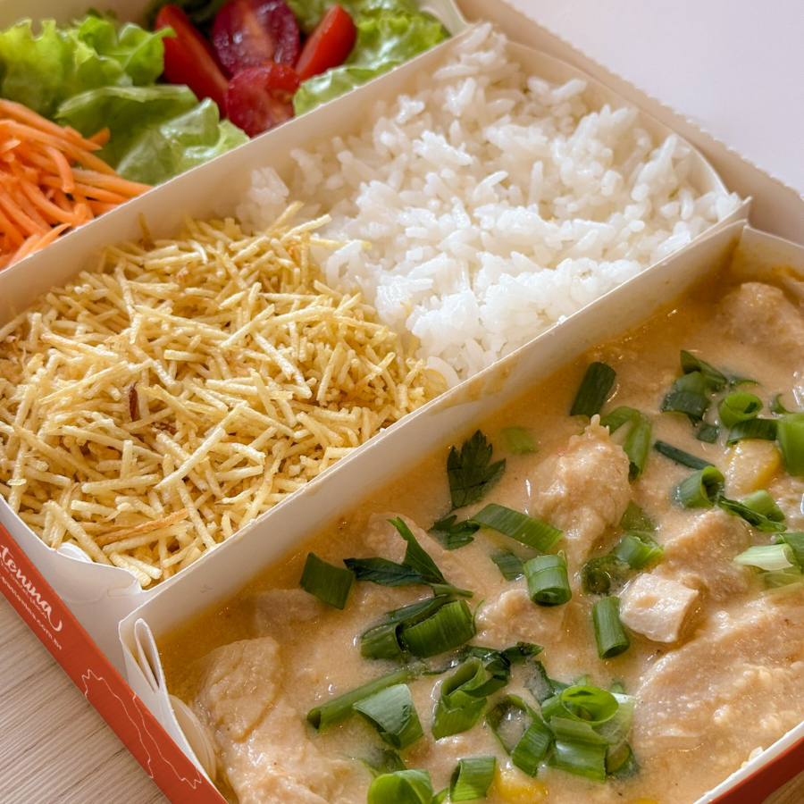 Strogonoff de frango preparado com molho cremoso especial. Acompanha arroz branco soltinho e batata palha crocante, salada verde com tomate cereja e cenoura ralada. Um clássico que abraça o paladar!"