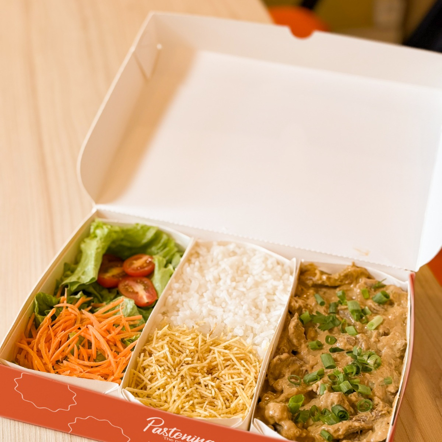 Strogonoff de carne preparado com molho cremoso especial. Acompanha arroz branco soltinho, batata palha crocante, salda verde com tomate cereja e cenoura ralada. Um clássico que abraça o paladar!"