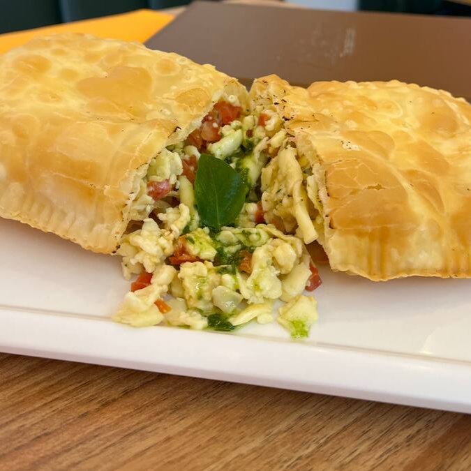 Pastel de Marguerita! Recheado com queijo mussarela, tomate e molho pesto de manjericão. Igual a esse não existe em Curitiba.