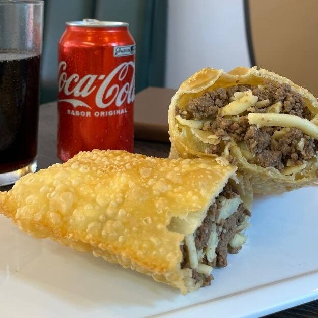 Pastel de carne de primeira, queijo mussarela e azeitonas verdes.