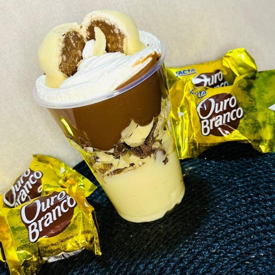 Camada de brigadeiro cremoso de chocolate branco, bombom Ouro Branco picados, camada de brigadeiro cremoso de chocolate 50% finalizado com Ouro Branco
