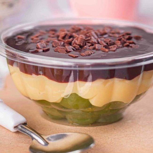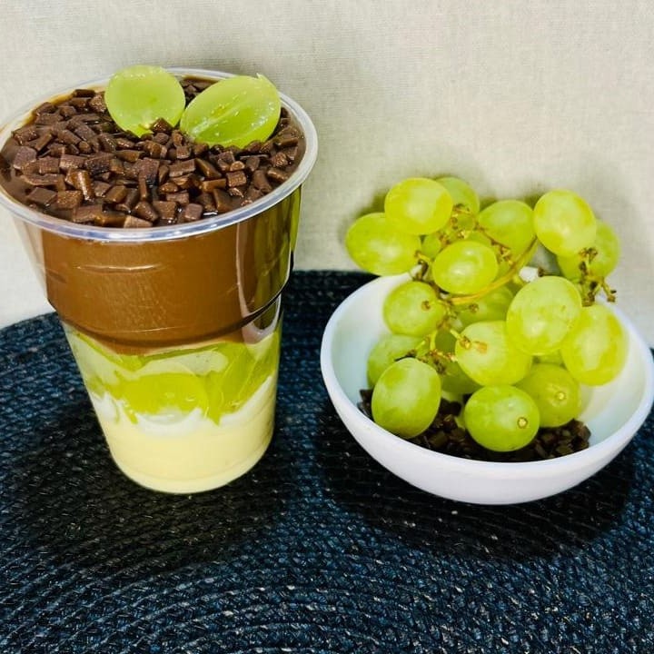Camada de brigadeiro cremoso de chocolate branco, Uvas picadas, camada de brigadeiro cremoso de chocolate 50% finalizado com granule e Uvas