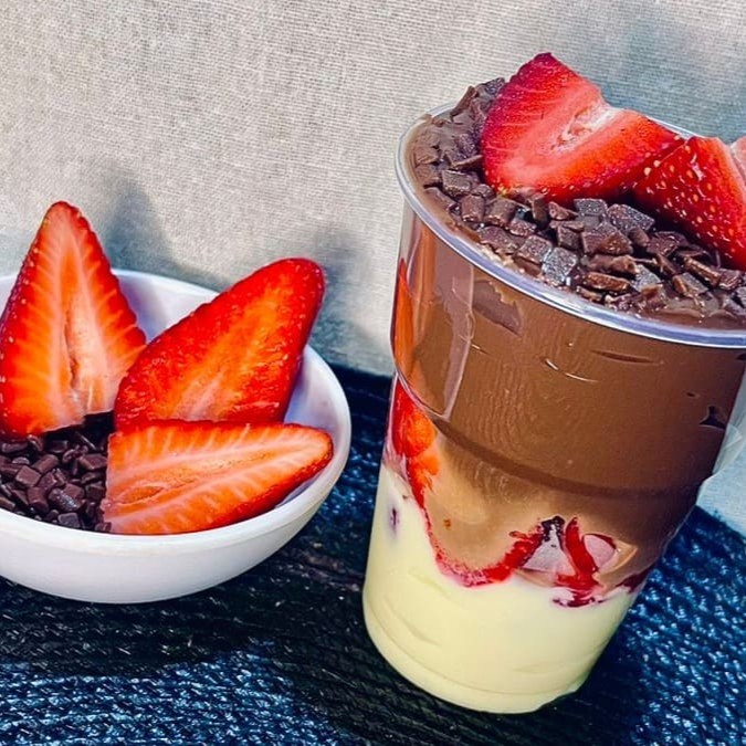 Morangos frescos picados, brigadeiro cremoso de chocolate branco finalizado com ganache de chocolate ao leite finalizado com Granule