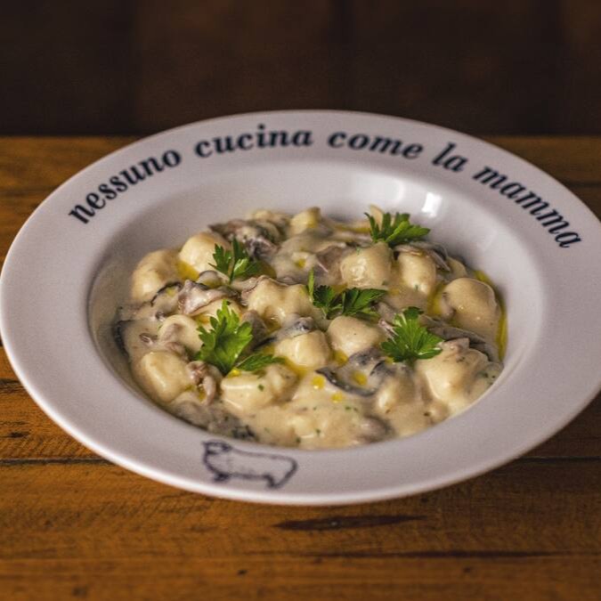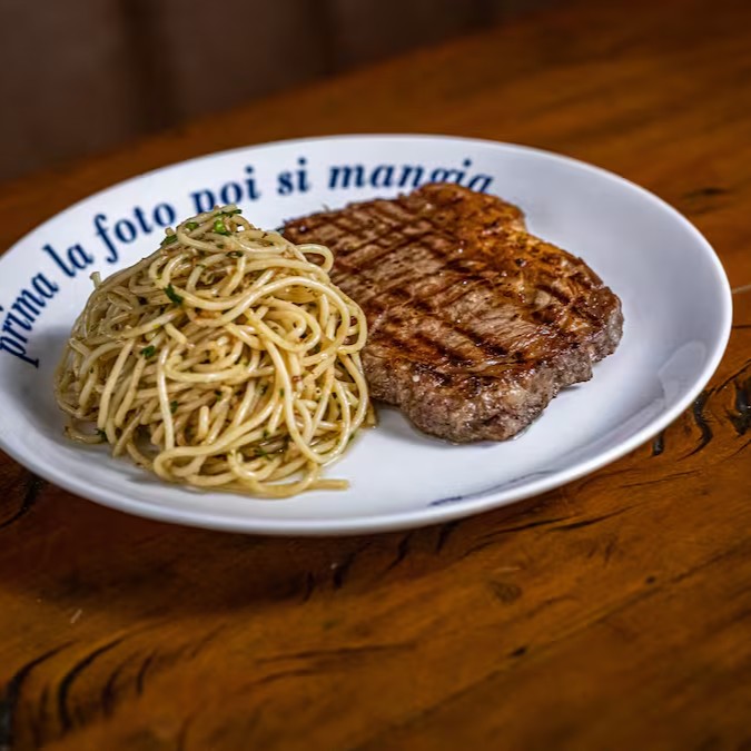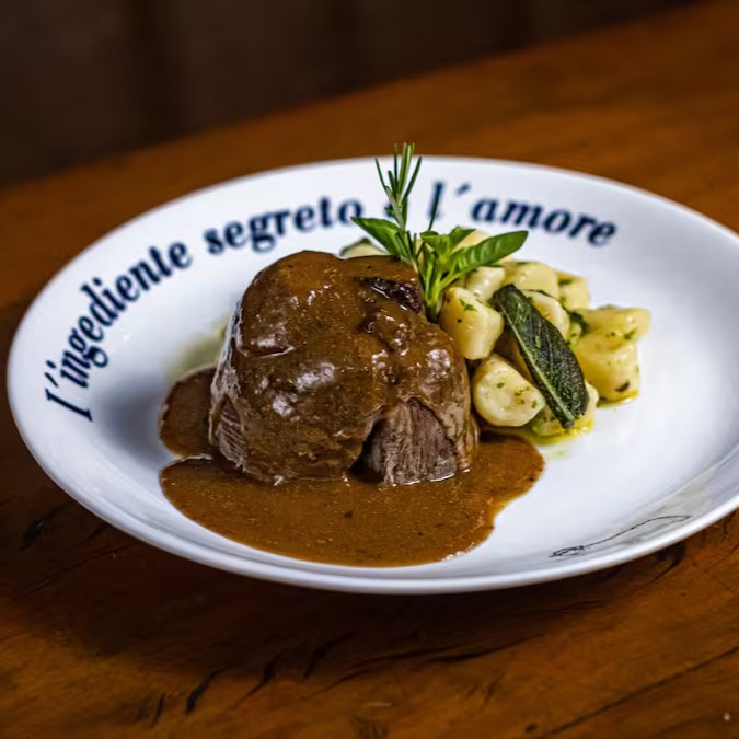 Gnocchi com molho de tomates italianos com tirinhas grelhadas de filé mignon