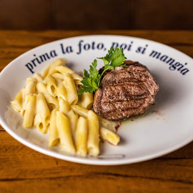 Medalhão grelhado com penne ao molho de queijo gorgonzola