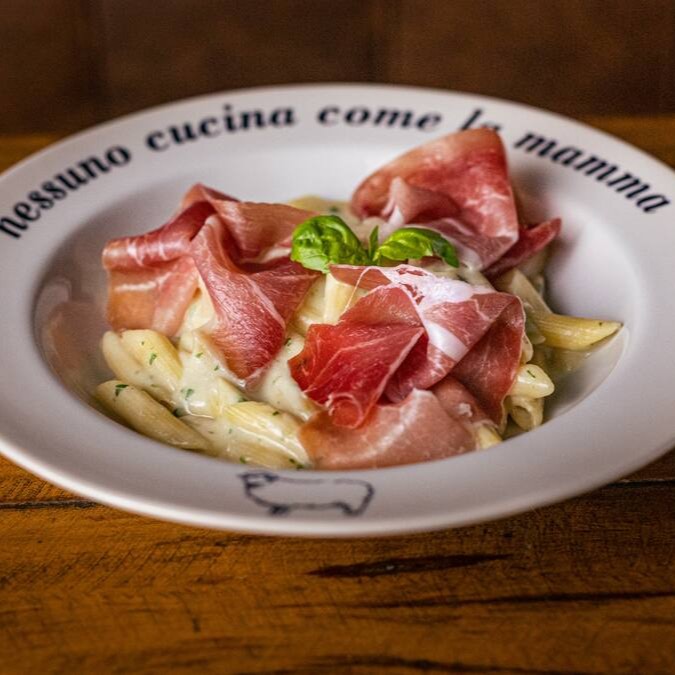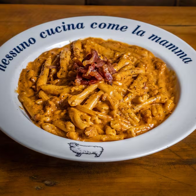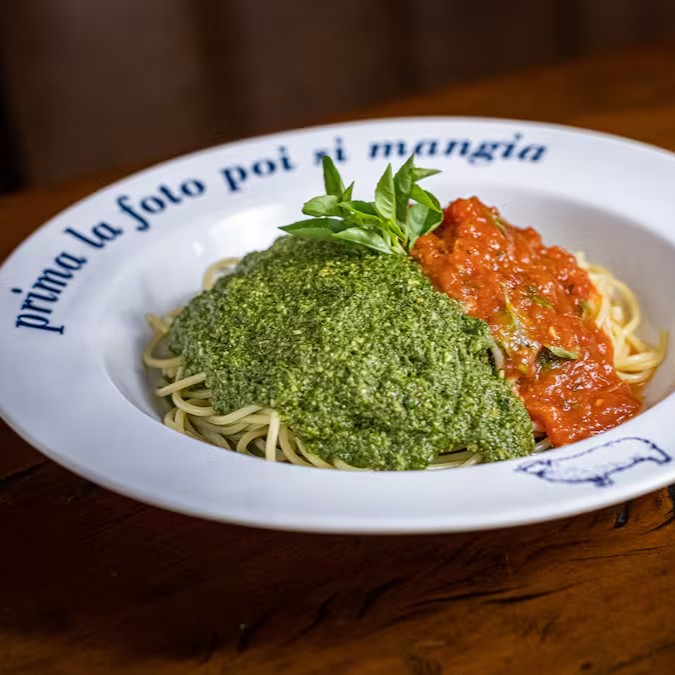 Casareccia na tradicional receita com molho carbonara e à matriciana em um único prato.