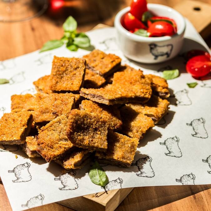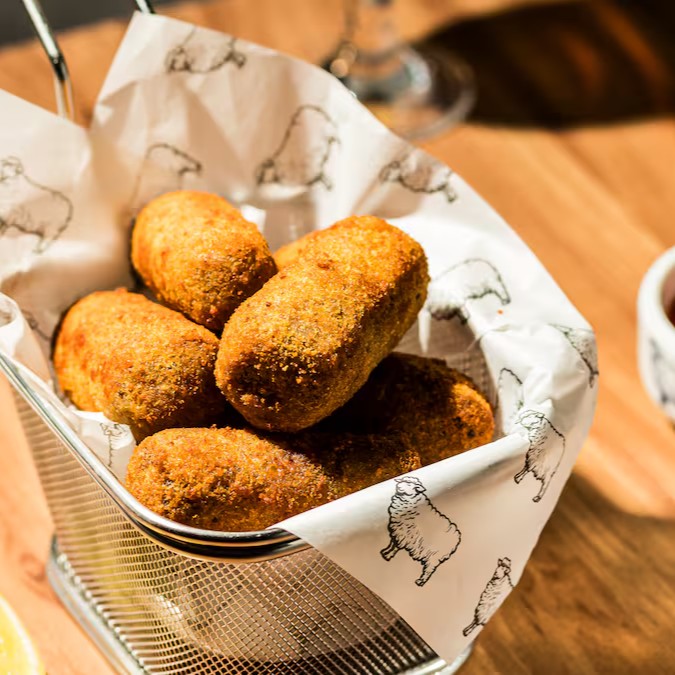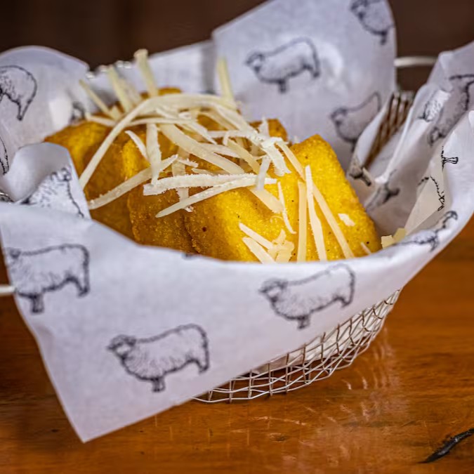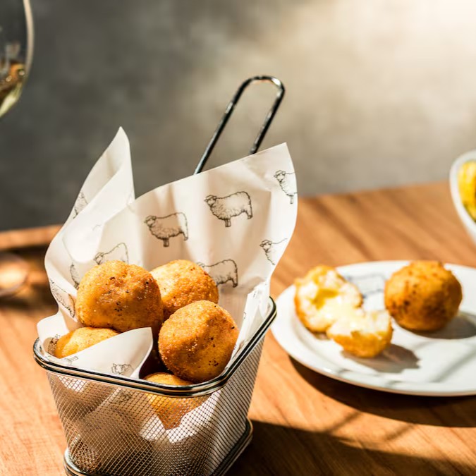 Bolinhos de risoto recheados com queijo mussarela. 6 unidades.