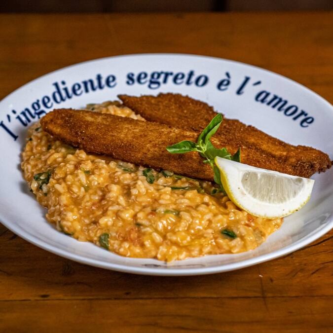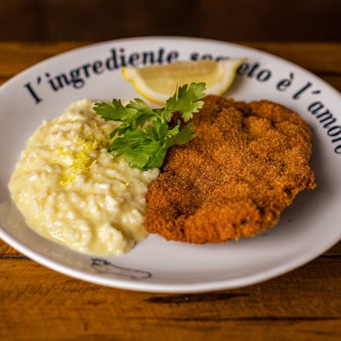Filé mignon à milanesa com risoto de limão siciliano ou com purê de batatas, rúculas e tomates cereja