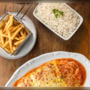 Filé à parmegiana (mignon ou frango) acompanhado de arroz branco, batatas fritas ou purê de batatas