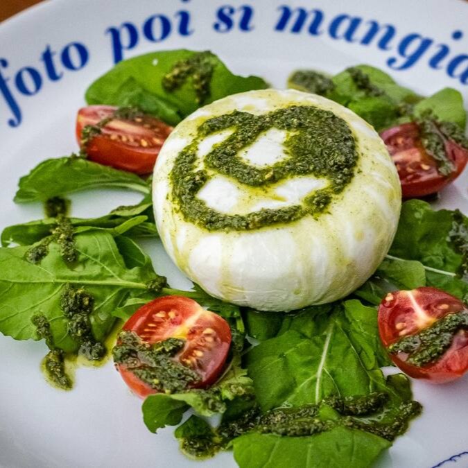 A verdadeira burrata com pesto e manjericão e tomates cereja.