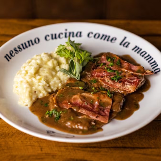 Escalope de mignon com presunto cru e sálvia acompanhado de risoto de queijo parmesão