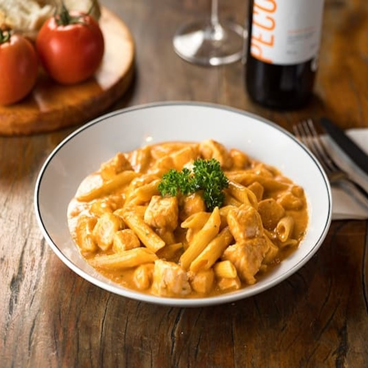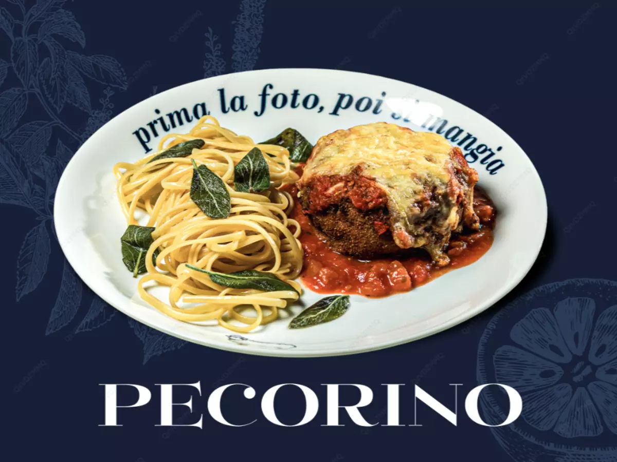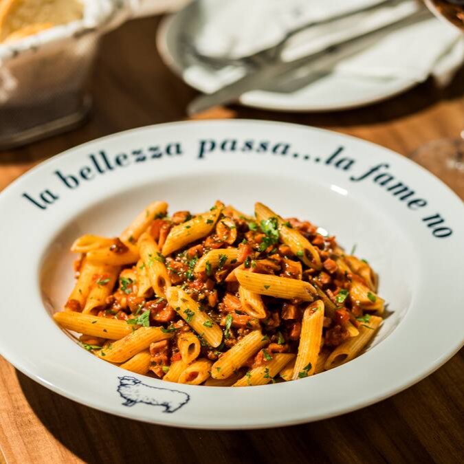 Penne com linguiça calabresa, molho de tomates, berinjela e queijo pecorino