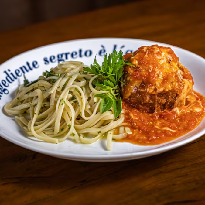 Polpetone recheado de mussarela coberto com molho de tomate e queijo parmesão, servido com linguine na manteiga