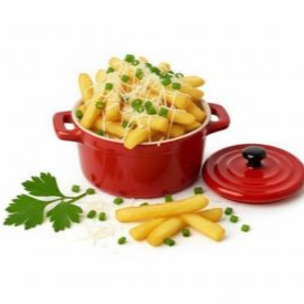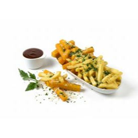 Batata frita crocante coberta com queijo mussarela ralado e cebolinha verde, uma porção cheia de sabor para acompanhar seus Peixe Inglês em Santa Felicidade,