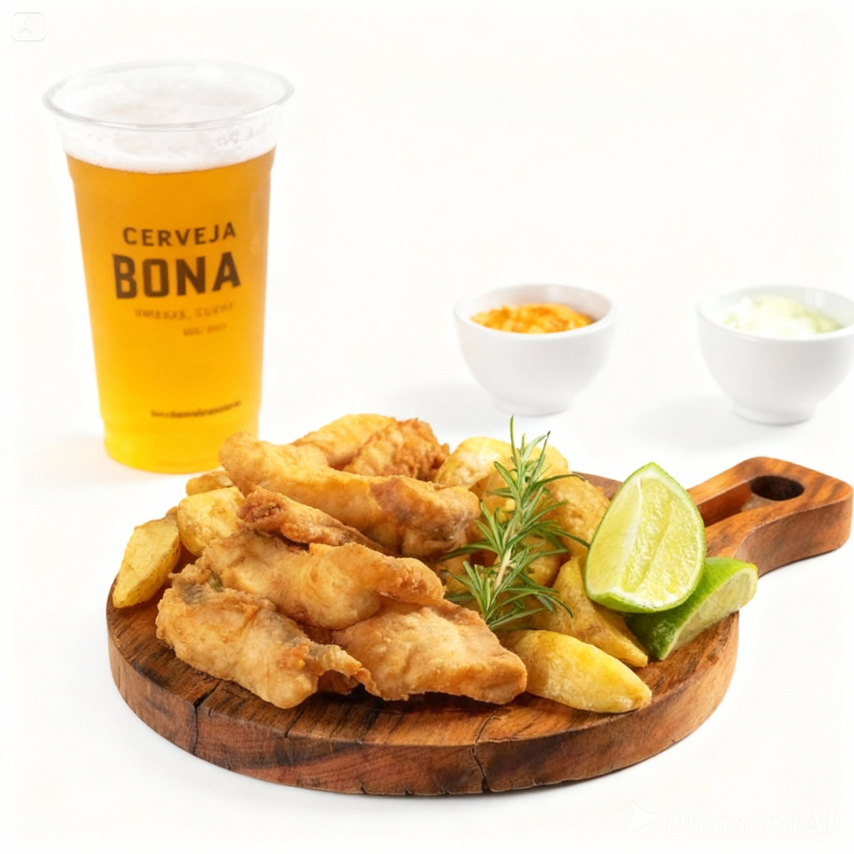 Suculentas iscas de tilápia empanadas na farinha de trigo, acompanhadas de batata crocante e tempero especial ao estilo clássico britânico do “Peixe Inglês”