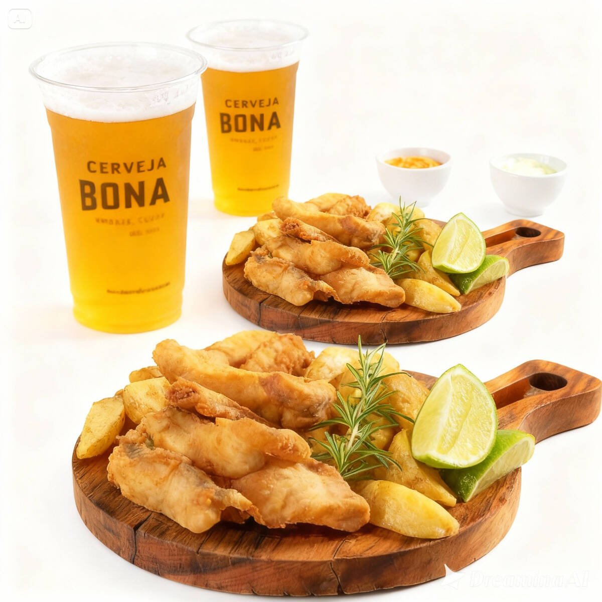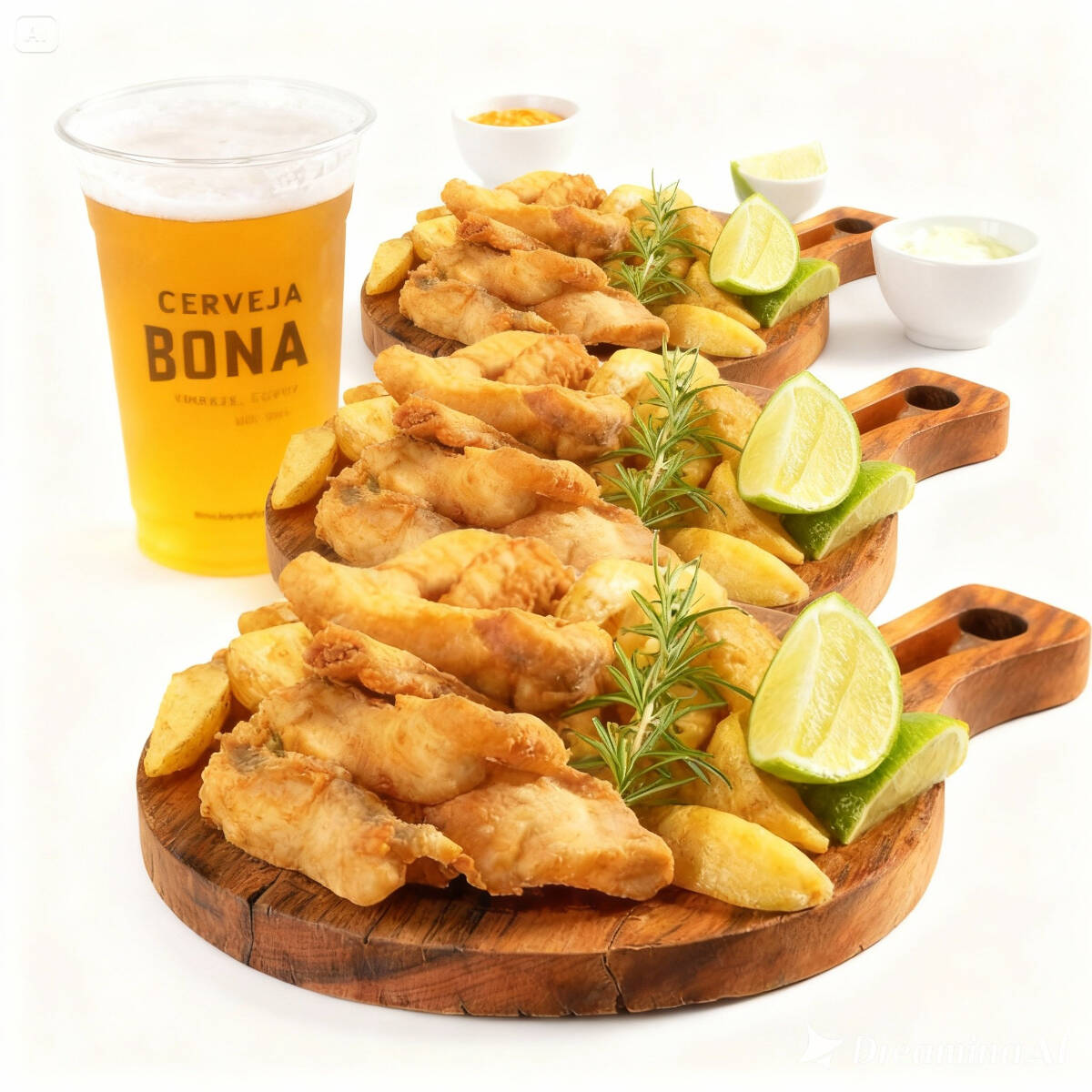 Tiras de tilápia empanadas e super crocantes, servidas com batatas rústicas douradas e limão. Perfeito para dividir e saborear com os amigos em qualquer rodada de conversa.