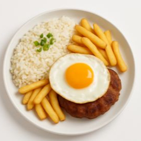Hambúrguer da casa, coberto com ovo frito, servido com arroz soltinho e batatas fritas bem crocantes. Uma opção completa e muito saborosa para matar a fome no delivery em Santa Felicidade, Curitiba