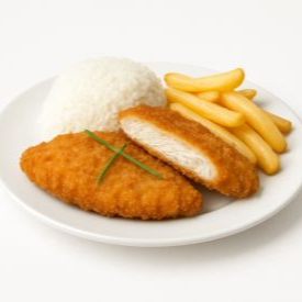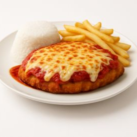 Filé de peito empanado com crosta de parmesão, servido com arroz branco soltinho e batatas douradas bem crocantes. Uma pedida clássica e muito saborosa para o seu prato feito ou delivery em Santa Felicidade, Curitiba