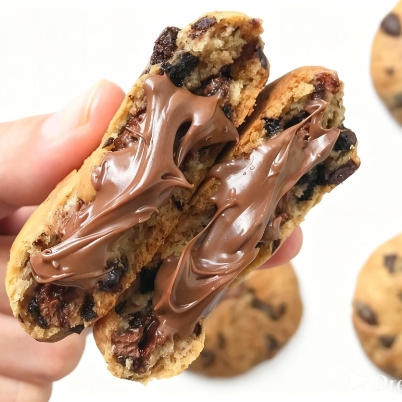 Cookie macio com generoso recheio cremoso de creme de avelã.