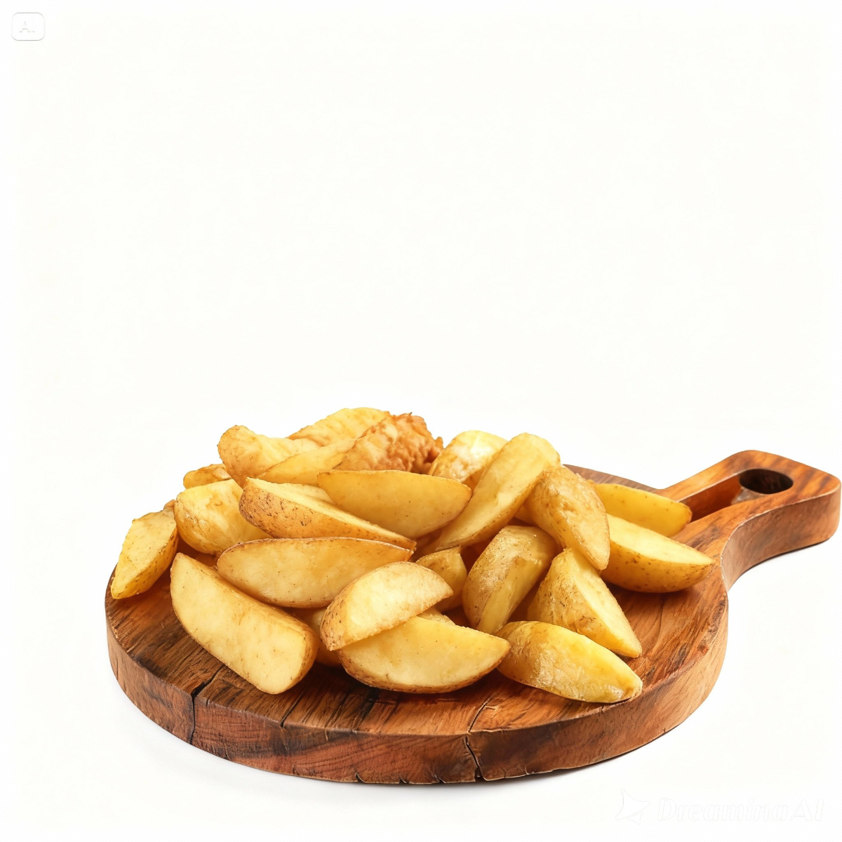 Batatas rústicas fritas, douradas e crocantes, em uma generosa porção de 300g para acompanhar seus baldes de frango em Santa Felicidade, Curitiba.