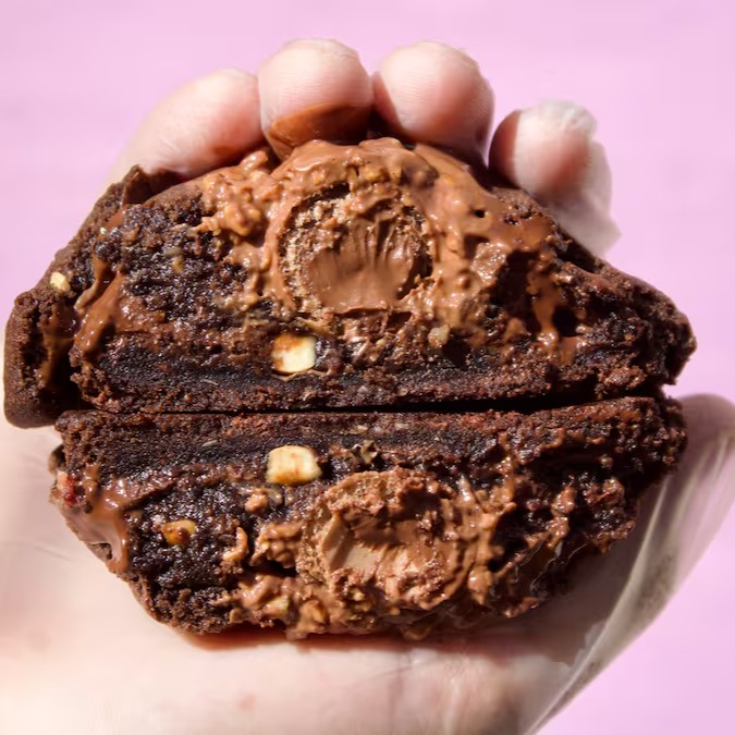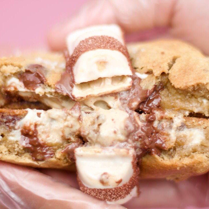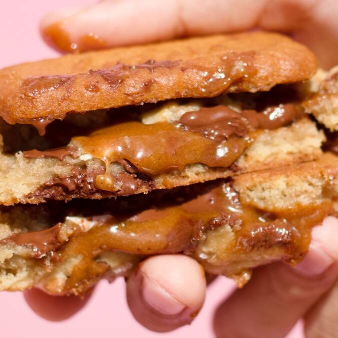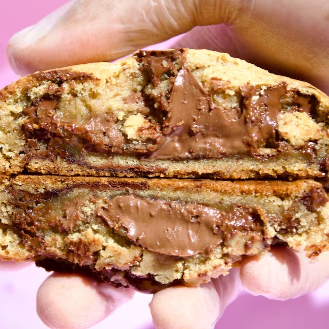 Cookie macio por dentro e crocante por fora, com gotas de chocolate meio amargo e recheado com muuuuita Nutella. 120g. :D