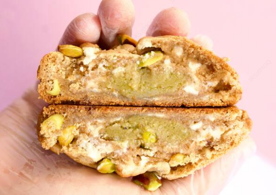Cookie macio por dentro e crocante por fora, massa tradicional com gotas de chocolate branco, muito pistache e recheado com nosso creme de pistache delicioso. 120g. E ainda finalizado com maaaais pistache. O melhor que você irá comer na vida! :)