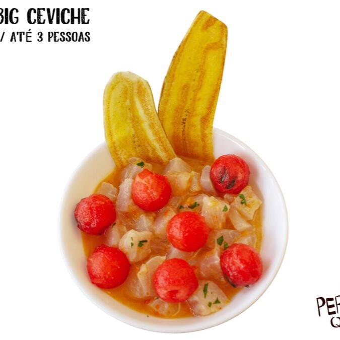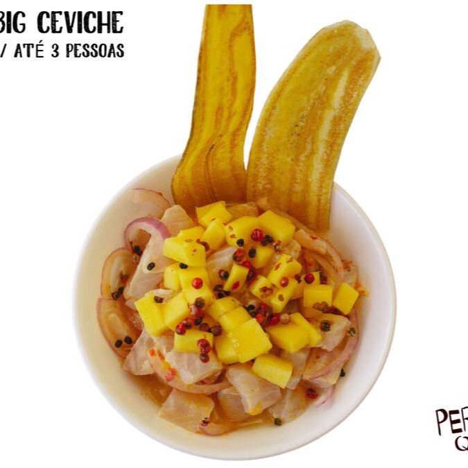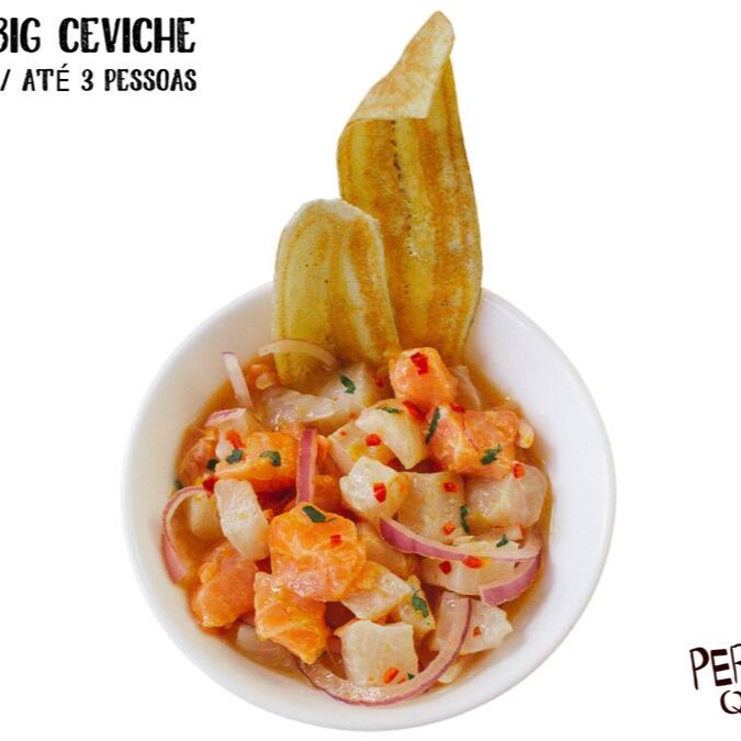 Cubos suculentos de tilápia e salmão (180g de proteína), cebola roxa, pimenta dedo de moça, coentro, leite de tigre, com limão, laranja e especiarias. Chips crocantes de banana.